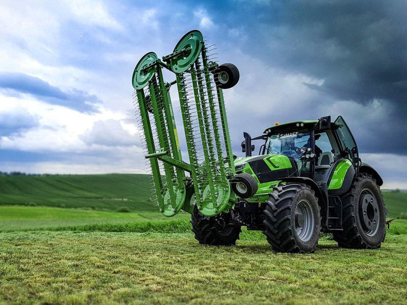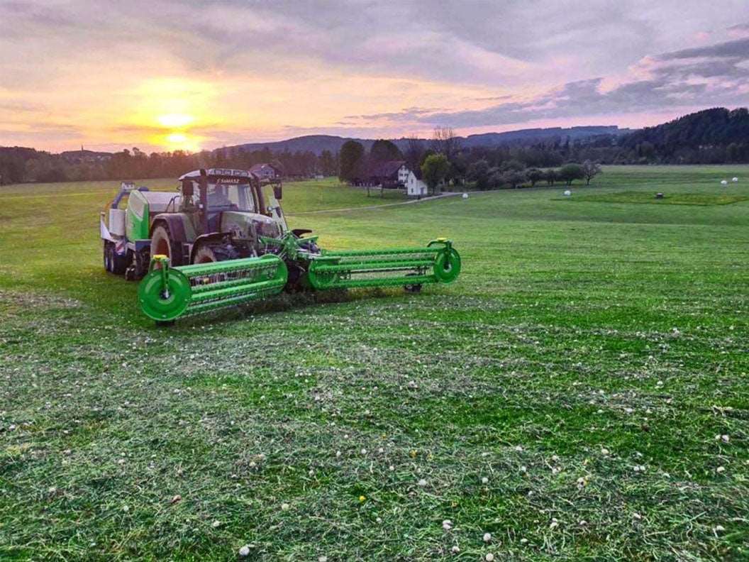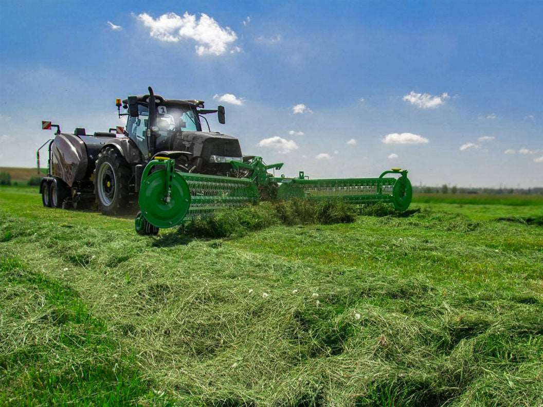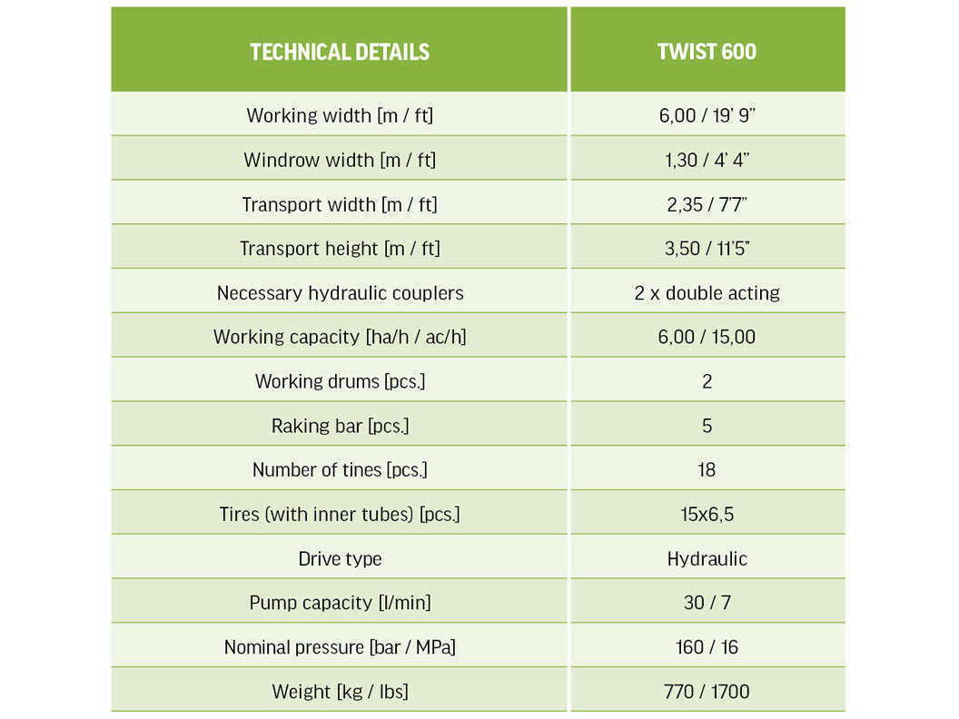 TWIST 600 is a 6m center delivery rake designed for a fast, efficient and clean raking of forage. It can be mounted to the front or rear of the tractor. With front mounting, you can simultaneously rake and work, e.g. with a baler.