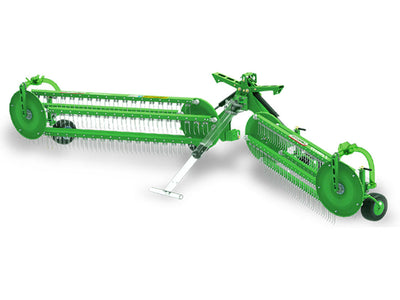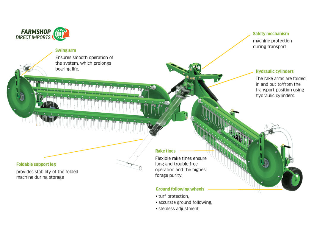 The rake consists of two working systems driven by tractor’s hydraulics using