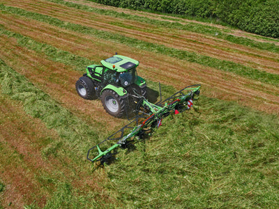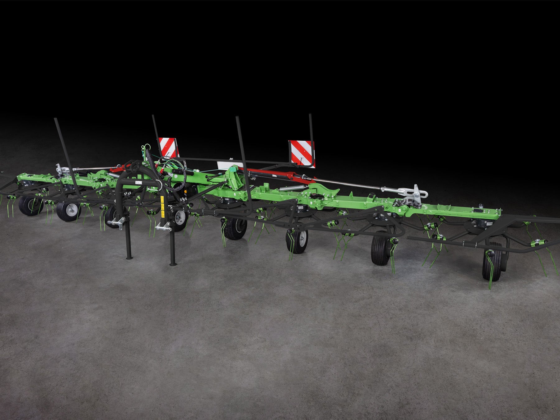 In addition, the hay tedders are equipped with a hydraulically unfolded screen to eliminate the loss of green fodder during tedding at the edge of the field, and the small diameter of the carousels and the stability of the working fingers guarantee that the entire swath is picked up even when tedding on the mower path without the use of a crusher.